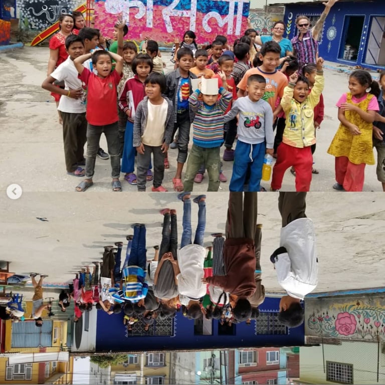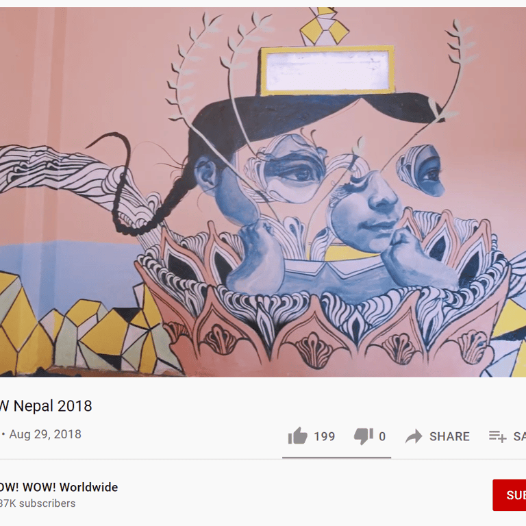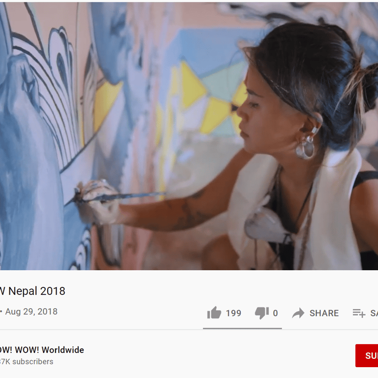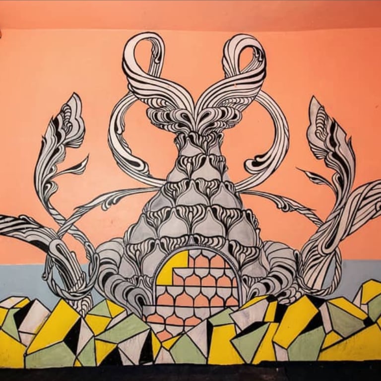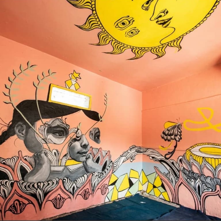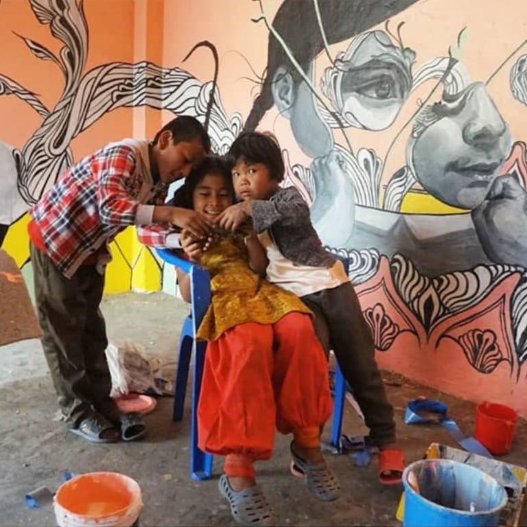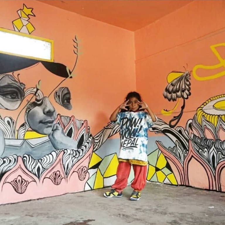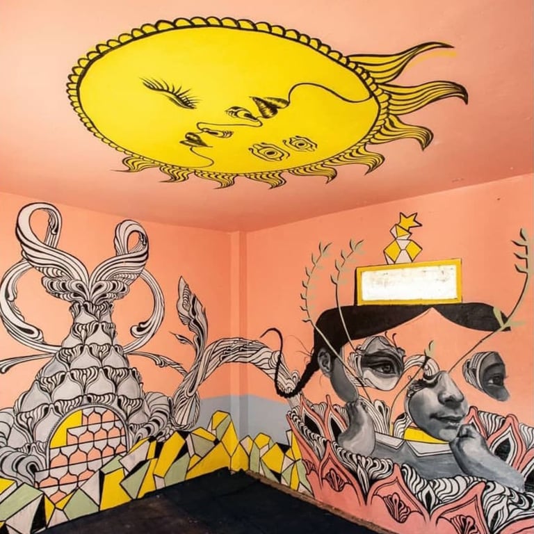 Caratoes was invited to Kathmandu, Nepal, to paint inside an orphan school. She aimed to create an environment where the children could dream up their own realities. Through her fertile, flowing designs, she encouraged them to see beauty and imagination—shapes so enchanting they could attract butterflies or transform into a spaceship to another world.